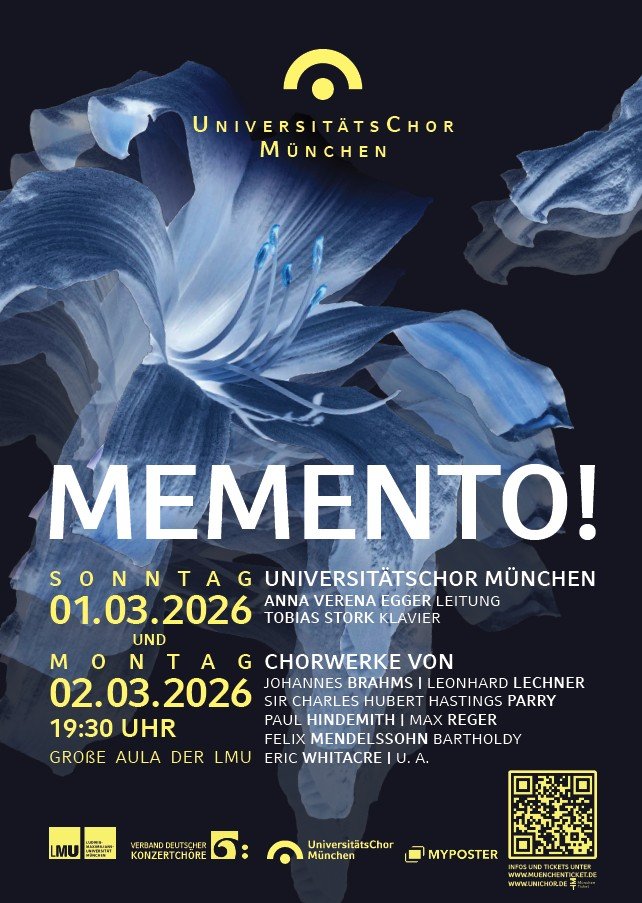 wir möchten Sie auf die Wintersemesterkonzerte des UniversitätsChors München unter dem Titel „Memento!“ am 1. März und 2. März 2026, um 19:30 Uhr aufmerksam machen.