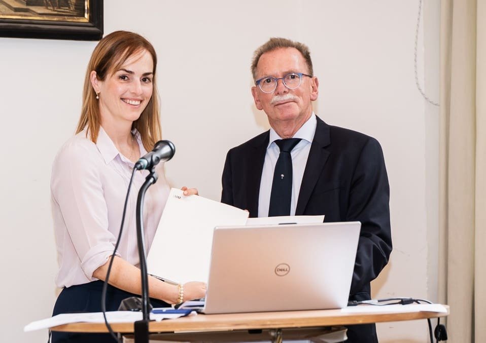 Wir freuen uns, wenn Frau PD Dr. Ibold bei uns zu Gast ist. Sie sehen Sie hier, zusammen mit Prof. Dr. Dr. Peter Höppe auf dem Bild bei der Preisverleihung am 15.07.2025 im Senatssaal der LMU.